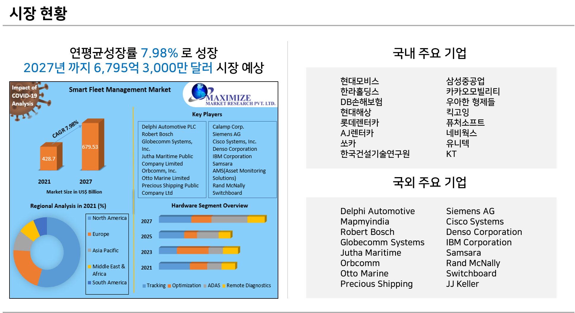 Fleet management의 시장상황은 연평균 성장률 7.98%로 성장하여 2027년 까지 약 6800억 달러까지 시장이 확대될 예상이며 Mapmyindia, Delphi Automotive 등 해외 기업 뿐만 아니라 현대차, 삼성중공업 등 국내기업에도 시장이 확대되고 있다.